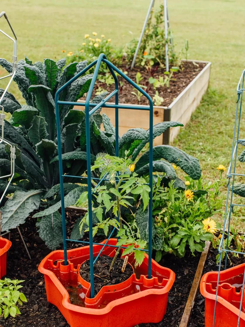 The two-piece design allows for use with a new or existing, already established plant. Higher walls protect stems, fend off cutworms, and discourage weeds. The base reservoir holds two gallons of water which releases water directly to the root zone. Tomatoes are notoriously thirsty plants so this feature is key!